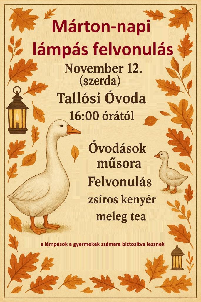 A tallósi Alapiskola és Óvoda sok szerettel meghívja a Kedves Szülőket és minden kedves érdeklődőt a harmadik alkalommal megrendezésre kerülő Márton- napi Lámpás felvonulásra!