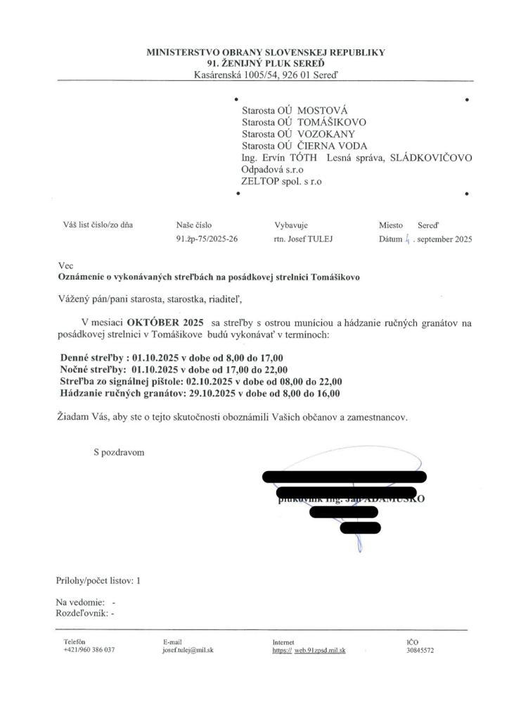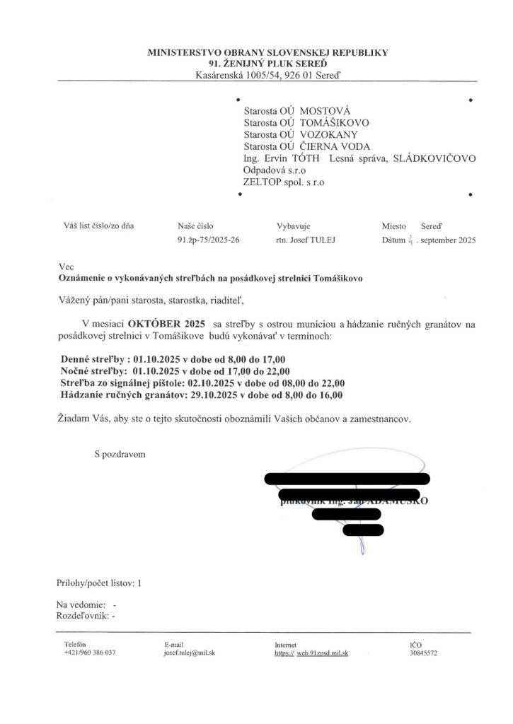 Oznámenie o vykonaní výcviku na strelnici v Tomášikove - streľby s ostrou muníciou a hádzanie ručných granátov