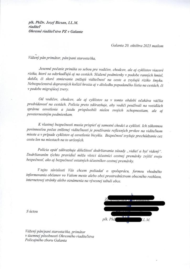Fényvisszaverő elemek használata - A Galántai Járási Rendőrség igazgatójának személyes levele