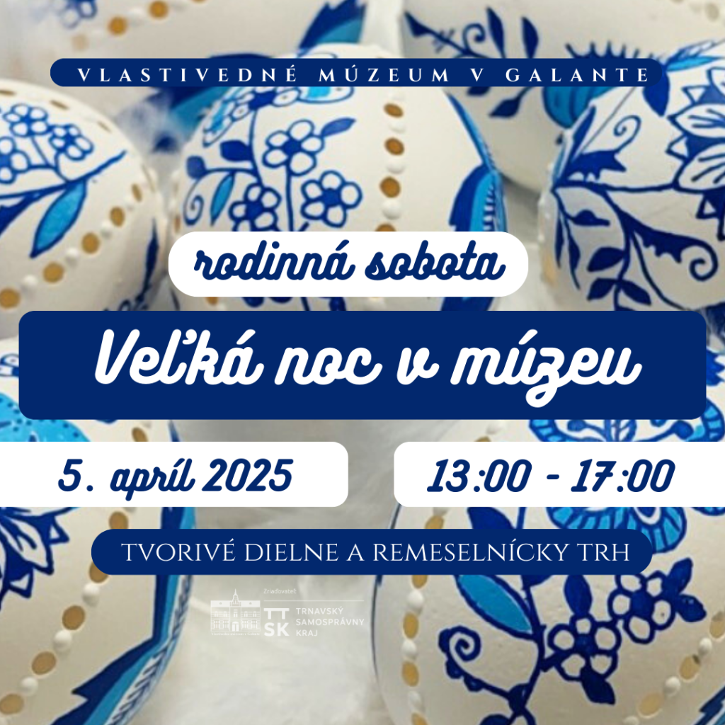 Vlastivedné múzeum v Galante srdečne pozýva záujemcov na veľkonočnú rodinnú sobotu. Dňa 5. apríla 2025, v sobotu poobede v priestoroch stálych expozícií návštevníkov čaká malý remeselný trh, zdobenie kraslíc, pletenie košíkov a ďalšie tematické tvorivé dielne. Program trvá od 13:00 do 17:00 hodín.