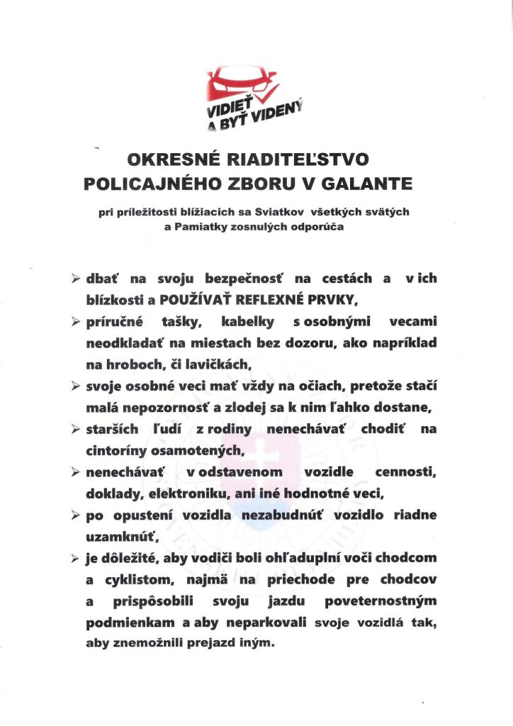 Z dôvodu blížiacich sa sviatkov Všetkých svätých a Pamiatky zosnulých, sa cintoríny stávajú miestami s frekventovanejším pohybom osôb a vozidiel. Veríme, že vzájomným rešpektovaním a dodržaním preventívnych rád môže každý prispieť k zvýšeniu vlastnej bezpečnosti a dôstojnému priebehu uctenia si pamiatky našich blízkych.