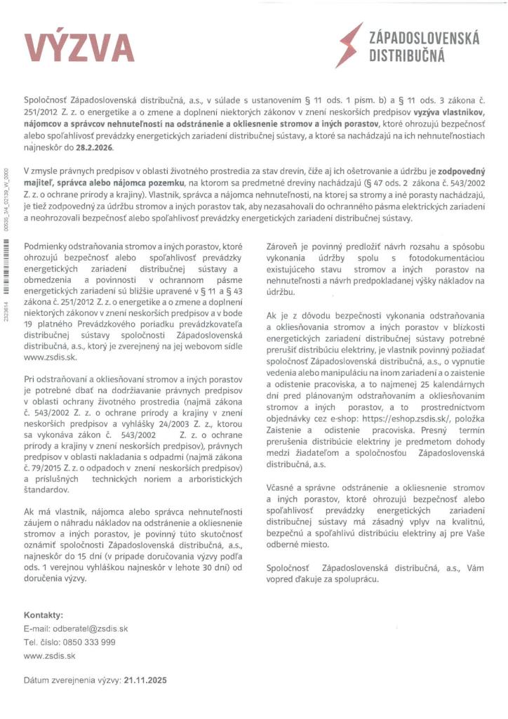 Výzva na odstránenie a okliesnenie stromov a iných porastov